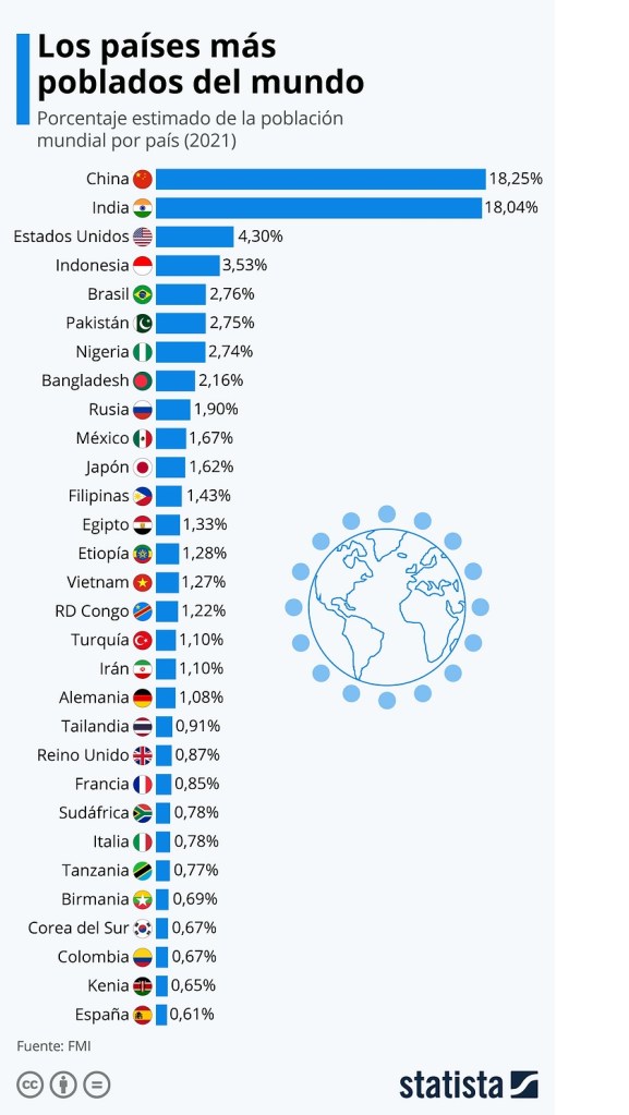 El 80% del crecimiento se concentra en las naciones con menos recursos. Y hay dos países, China y la India, que concentran el 35% del total (2.800 millones) de los seres humanos que habitan el Mundo. Es más, la tendencia apunta a que en los próximos meses India superará a China como el país más poblado, superando los 1.400 millones de habitantes. El tercer país con mayor población del mundo es Estados Unidos (con unos 330 millones), seguido por Indonesia (276 millones) y Pakistán (225 millones). En sexto lugar aparece la primera nación de América Latina, Brasil, con 215 millones de habitantes. Argentina, con 47,7 millones, figura en el puesto 31. El problema es que las tasas de crecimiento poblacional más elevadas se dan en países con mucha pobreza.