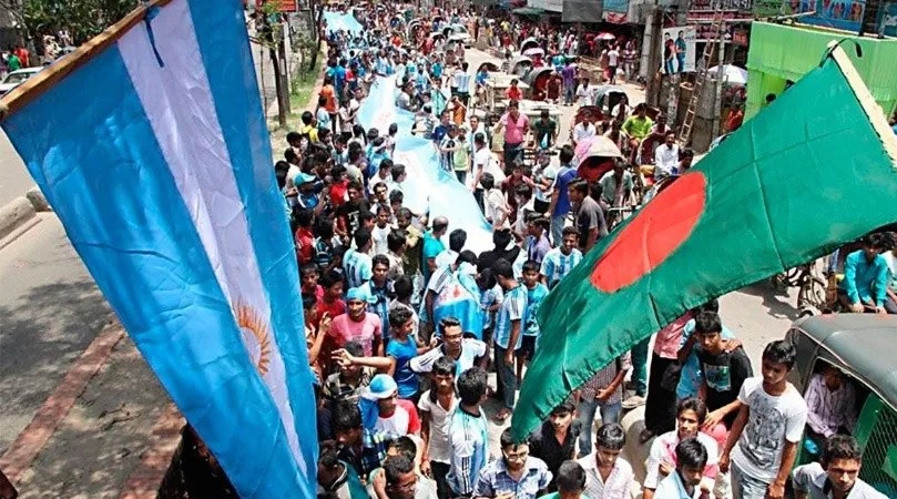 Miles de habitantes del país asiático festejan con locura cada triunfo de la Selección masculina albiceleste de fútbol, por su calidad deportiva y por razones históricas y políticas. Ese país estuvo colonizado por Corona Británica, que ocasionó daños y expoliación económica. Cuando Diego Maradona -en el Mundial México ’86- humilló a los ingleses con dos goles eternos -el de «La mano de Dios» y con las gambetas del “mejor gol de todos los Mundiales», los bangladesíes sintieron propia la venganza por la Guerra de Malvinas y se identificaron por sus propios padecimientos con los británicos. Así nació un amor que se fortalece con cada Campeonato Mundial de Fútbol.
