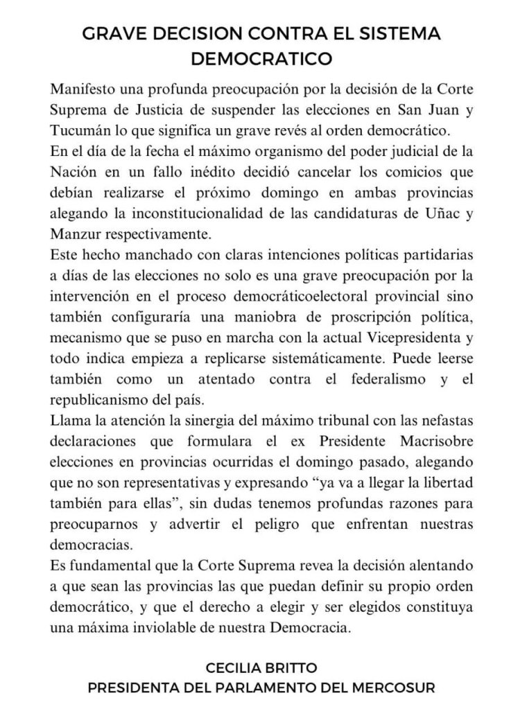 “Es fundamental que la Corte Suprema revea la decisión alentando a que sean las provincias las que puedan definir su propio orden democrático, y que el derecho a elegir y ser elegidos constituya una máxima inviolable de nuestra democracia”, dice el texto que lleva la firma de Cecilia Britto, presidenta del Parlamento del Mercosur.