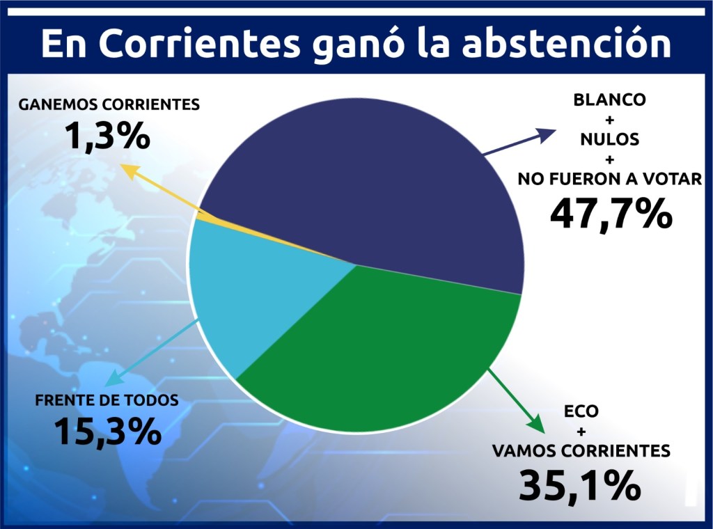 Dentro de este universo, ECO + Vamos Corrientes obtuvo 325.211 votos. Mucho menos de los 440 mil que no votaron o votaron en blanco.