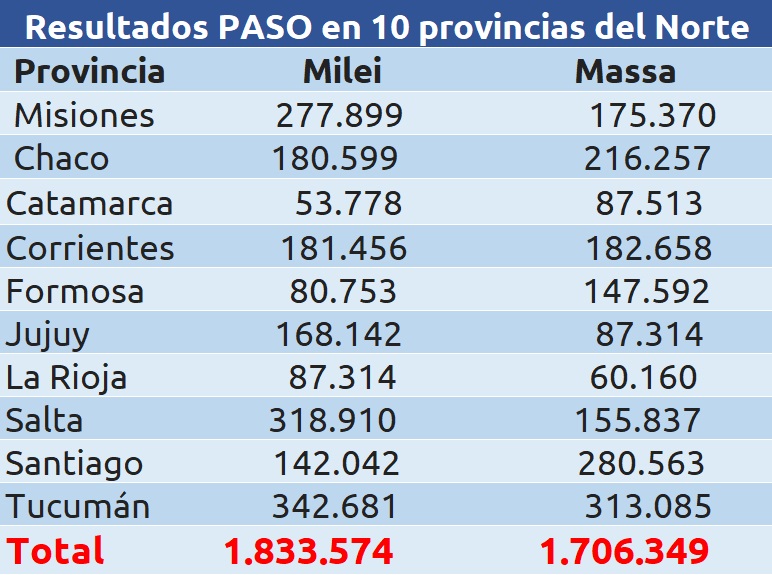 Sumada las diez provincias del Norte Grande, Milei, aunque ganó en varias provincias del norte, obtuvo una diferencia de apenas 127.225 según surge del siguiente cuadro: