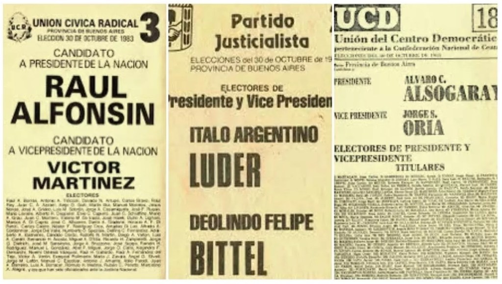 En las elecciones de 1983, la fórmula de la Unión Cívica Radical, encabezada por Raúl Alfonsín y Víctor Martínez, triunfó sobre el peronismo liderado por Ítalo Luder y Deolindo Felipe Bittel. La UCR obtuvo casi el 52 % de los votos y colocó a Alfonsín como el nuevo presidente de Argentina en la Casa Rosada, el 10 de diciembre de ese mismo año.
