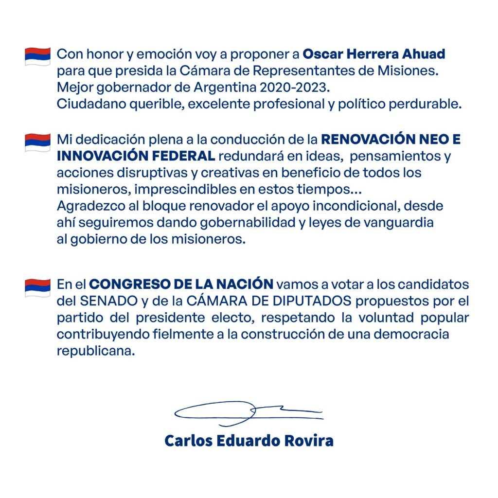 Un posteo breve con tres anuncios: Rovira propone a Oscar Herrera Ahuad como nuevo titular de la Legislatura. En lo político partidario se dedicará a pleno a la conducción de la Renovación Neo –ámbito provincial- e Innovación Federal –Nacional-. Los diputados nacionales y senadores electos por la Renovación misionera votarán a favor de las autoridades del Congreso propuestas por la nueva alianza que gobernará la Argentina.