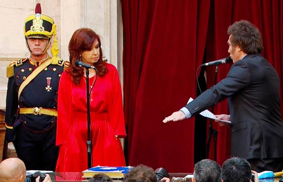 Domingo 10 de diciembre de 2023 (Télam). Este domingo Javier Milei (53) juró a las 11.56 como Presidente de la Nación ante la Asamblea Legislativa reunida en el recinto de la Cámara de Diputados del Congreso nacional utilizando la fórmula por «la Patria y los Santos Evangelios». (N de la R: Cristina Fernández de Kirchner anunció el juramento que los nuevos mandatarios leyeron, en primera persona, mientras en el recinto los asistentes coreaban «Libertad, libertad»).