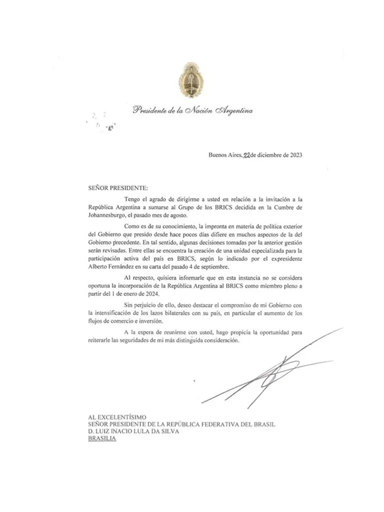 Como es de su conocimiento, la impronta en materia de política exterior del Gobierno que presido desde hace pocos días difiere en muchos aspectos de la del Gobierno precedente. En tal sentido, algunas decisiones tomadas por la anterior gestión serán revisadas. Entre ellas se encuentra la creación de una unidad especializada para la participación activa del país en BRICS, según lo indicado por el expresidente Alberto Fernández en su carta del pasado 4 de septiembre.