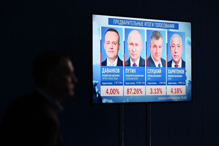 Según la comisión electoral rusa, el jefe del Kremlin obtuvo 87,97% de los votos tras el recuento de los sufragios en 24% de los colegios electorales. Los datos sitúan en segundo lugar a Nikolai Jaritonov (4,01%), seguido de Vladislav Davankov (3,86%) y Leonid Slutski (3,02%). «Rusia eligió», declaró la jefa de la Comisión Electoral, Ella Pamfilova, que anunció que la participación alcanzó la cifra récord del 74,22%.