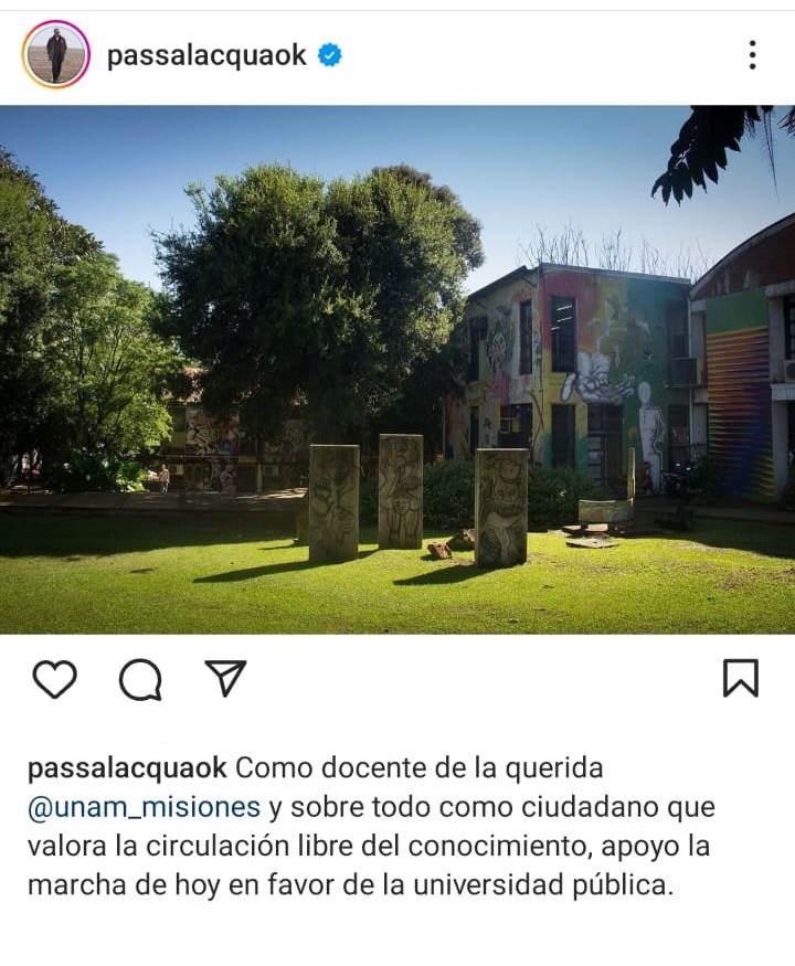 “Como docente de la querida @UNaM-Misiones y sobre todo como ciudadano que valora la circulación libre del conocimiento, apoyo la marcha de hoy en favor de la universidad pública”, posteó Passalacqua a través de sus redes sociales e ilustró el mensaje con una fotografía del edificio de la Facultad de Artes de Oberá.