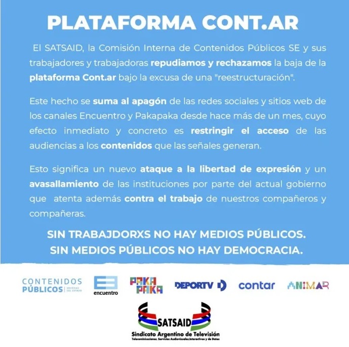 Por su parte, desde Satsaid, la comisión interna de Contenidos Públicos SE y sus trabajadores y trabajadores rechazaron la medida calificándola de un «ataque a la libertad de expresión», tal como se observa en la imagen que difundieron al respecto.