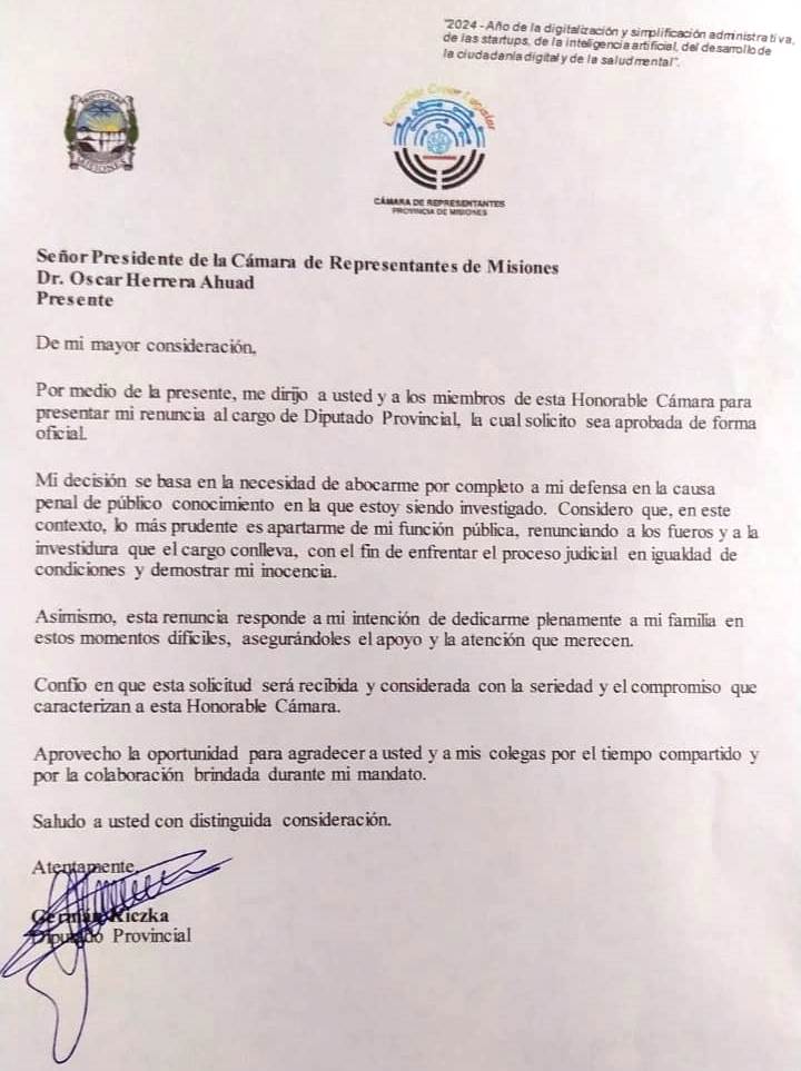 Sábado 10 de agosto de 2024. El diputado provincial Germán Kiczka presentó su renuncia a la banca que ocupa en la Legislatura de Misiones, tras verse involucrado en una investigación que lo vincula indirectamente a una causa de distribución de pornografía infantil. En un comunicado difundido en la tarde de este sábado, Kiczka aseguró que no tiene relación alguna con los cargos que se le imputan, aunque la presión política y social lo llevó a tomar la decisión de apartarse de su cargo.