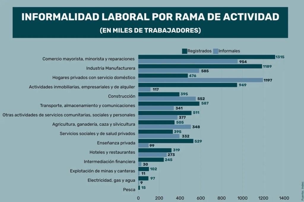 El servicio doméstico es de los sectores más golpeados por la informalidad, ya que de los 1.673.000 trabajadores en esta área, el 71,5% no realiza aportes previsionales. A su vez, la industria agrícola también presenta una alta tasa de empleo en negro, con un 59,2% de sus 853.000 trabajadores sin registrar.