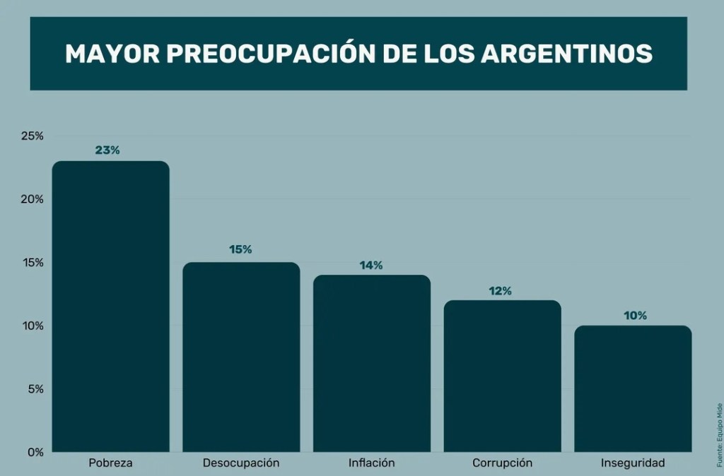 La creciente informalidad no pasa desapercibida para la sociedad y, según la encuesta realizada por la consultora Equipo Mide, el 23% de la población considera la pobreza su principal preocupación, seguida por la desocupación (15%) y la inflación (14%).
