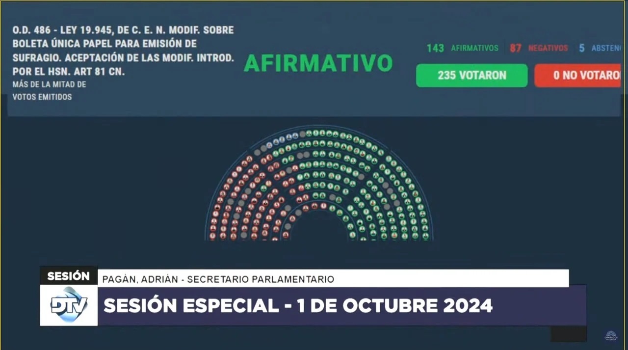 Martes 1 de octubre de 2024 (NA). La Cámara de Diputados convirtió hoy en ley el proyecto de Boleta Única de Papel para cargos nacionales, sistema que empezará a utilizarse en las elecciones intermedias del año que viene.