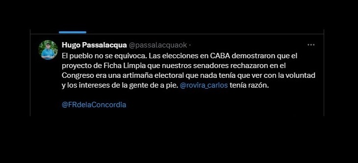Lunes 19 de mayo de 2025. «El pueblo no se equivoca. Las elecciones en CABA demostraron que el proyecto de Ficha Limpia que nuestros senadores rechazaron en el Congreso era una artimaña electoral que nada tenía que ver con la voluntad y los intereses de la gente de a pie. @rovira_carlos tenía razón», escribió Hugo Passalacqua en su red de X.