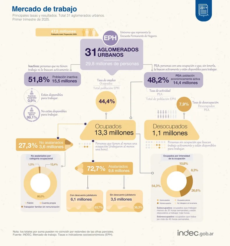 Uno de los aspectos más delicados del informe del INDEC es el crecimiento de la precarización. La tasa de informalidad se mantuvo elevada: en el primer trimestre de 2025, el 42% de las personas ocupadas no tiene cobertura formal, una cifra que se mantiene por encima de los niveles pre pandemia.
