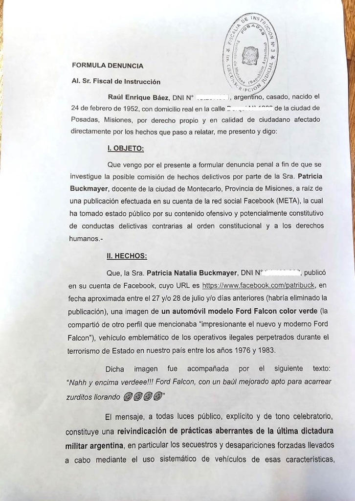 La denuncia contra Patricia Buckmeyer es por apología del terrorismo de Estado. La presentó Raúl «Rulo» Báez, expreso político, detenido y trasladado en el baúl de un Ford Falcon verde durante la dictadura. La denunciada, docente y concejal electa por la Libertad Avanza, se burló de las víctimas que fueron secuestradas en esos vehículos para ser tortutrados y muchos de ellos, desaparecidos hasta la actualidad: la mujer festejó la vuelta de esos vehiculos con el baúl amplio para trasladar zurditos llorones. Después intentó pedir disculpas, no a los que ofendió sino a los que se sintieron ofendidos, según expresó en sus redes.