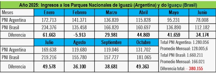 El principal dato es que, de enero a octubre, 380.155 visitantes (brasileros y extranjeros) que ingresaron a las “cataratas brasileras” no ingresaron al Parque Nacional Iguazú (Argentina), o si lo queremos ver de otra forma, 380.155 personas más ingresaron al Parque Nacional do Iguaçu (Brasil).