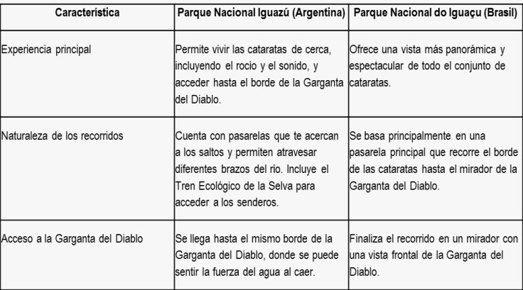 Si uno le pregunta a cualquier actor del turismo cuál es la diferencia entre el Parque Nacional Iguazú (Argentina) y el Parque Nacional do Iguaçu (Brasil), sin dudar nos dirá que “en Brasil tenemos las vistas más panorámicas de las cataratas, y en Argentina tenés la posibilidad de vivir los saltos, incluyendo la Garganta del Diablo”. La IA te lo resume en estas tres variables.