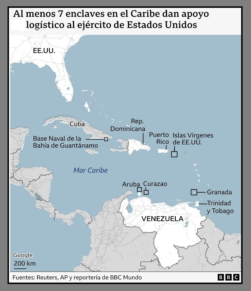 En un artículo de la BBC, describen –refiriéndose al presente conflicto entre Estados Unidos y Venezuela– que toda movilización, por más poderosa que sea, necesita todo tipo de asistencia: pistas de aterrizaje, puntos de abastecimiento, radares en puestos avanzados, maniobras o campamentos para sus soldados, y espacio para almacenar equipos.