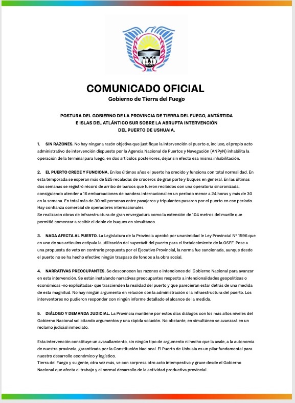 El Gobierno de Tierra del Fuego rechazó la medida y aseguró que judicializará el caso. Denuncian extorsión y «un avasallamiento importante a la autonomía de la provincia» porque, entienden, «no hay razones» para la intervención; el puerto crece y funciona, nada afecta al puerto, existen narrativas preocupantes, hay diálogo con el Gobierno nacional y habrá acciones judicailes», según dice un comunicado oficial de cinco puntos del Gobierno provincial.