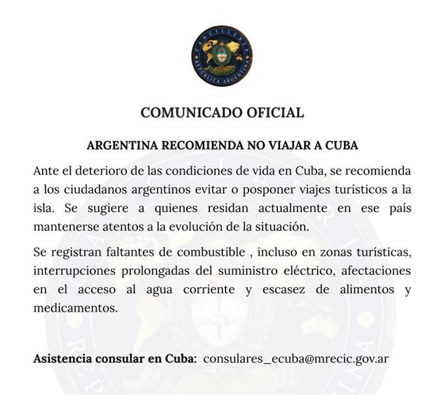 Emitió un comunicado advirtiendo sobre el deterioro de las condiciones de vida en Cuba y sugirió evitar viajes turísticos a la isla. La advertencia llega en un contexto de creciente presión de Estados Unidos. Donald Trump planea un bloqueo naval y total para Cuba: «No entrará nada». Argentina sugirió a quienes ya se encuentran en territorio cubano “mantenerse atentos a la evolución de la situación”.