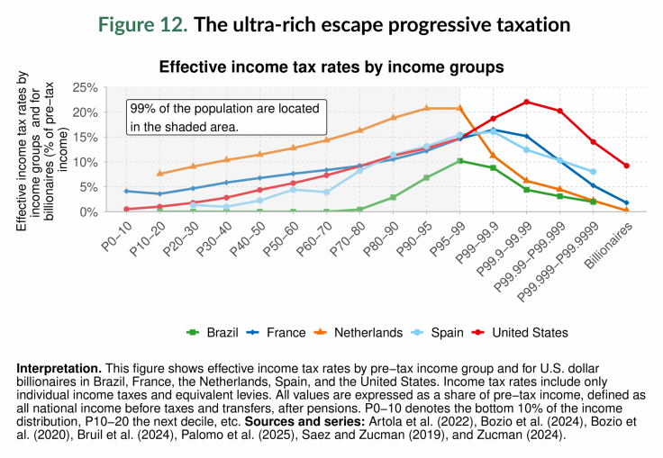 Además, la fiscalidad a menudo falla donde más se necesita: en la cúspide misma de la distribución. La Figura 12 revela cómo los ultra-ricos escapan a la tributación. Las tasas impositivas efectivas sobre la renta aumentan constantemente para la mayor parte de la población, pero caen abruptamente para multimillonarios y centimillonarios. Estas élites pagan proporcionalmente menos que la mayoría de los hogares que obtienen ingresos mucho más bajos. Este patrón regresivo priva a los estados de recursos para inversiones esenciales en educación, salud y acción climática. También socava la equidad y la cohesión social al disminuir la confianza en el sistema tributario. La fiscalidad progresiva es, por tanto, crucial: no solo moviliza ingresos para financiar bienes públicos y reducir la desigualdad, sino que también fortalece la legitimidad de los sistemas fiscales al garantizar que quienes tienen mayores medios contribuyan con su parte justa.