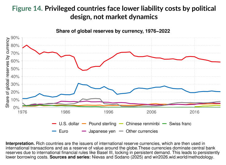 La demanda persistente de activos «seguros» como los bonos del Tesoro de EE. UU. y los bonos soberanos europeos, reforzada por las reservas de los bancos centrales, los estándares regulatorios (es decir, Basilea III) y los juicios de las agencias de calificación crediticia, consolida esta ventaja (ver Figura 14). El resultado es que los países ricos piden prestado consistentemente más barato mientras invierten en activos de mayor rendimiento en el extranjero, posicionándose como rentistas financieros a expensas de las naciones más pobres.