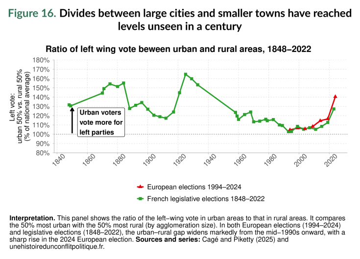 Quinto, analizamos cómo la desigualdad remodela las divisiones políticas y la representación democrática. La evidencia en este informe muestra que la representación de la clase trabajadora en los parlamentos ha sido históricamente baja y ha disminuido aún más en las últimas décadas, reduciendo el espacio para políticas redistributivas. En las democracias occidentales, las divisiones políticas por ingresos y educación se han desconectado, produciendo sistemas de partidos de «múltiples élites» en los que los votantes altamente educados se inclinan hacia la izquierda y los votantes de altos ingresos siguen alineados con la derecha. Esta fragmentación ha debilitado las amplias coaliciones para la redistribución. La geografía también ha resurgido como una división central, con votantes rurales y urbanos cada vez más polarizados, fragmentando aún más la mayoría trabajadora. Parecen necesarias plataformas políticas más ambiciosas e inclusivas para reconstruir las coaliciones redistributivas del pasado.