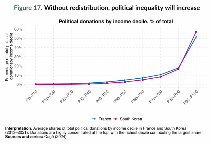 Esta fragmentación erosiona los fundamentos políticos necesarios para abordar la desigualdad e impide la implementación de políticas redistributivas. Mientras tanto, la influencia de la riqueza en la política agrava la desigualdad en la influencia política. La Figura 17 muestra cómo la financiación de campañas está fuertemente concentrada entre los que más ganan: en Francia y Corea del Sur, el 10% más rico de los ciudadanos proporciona desproporcionadamente la mayoría de las donaciones políticas. Esta concentración de poder financiero amplifica las voces de la élite, reduce el espacio para políticas equitativas y margina aún más a la mayoría trabajadora.