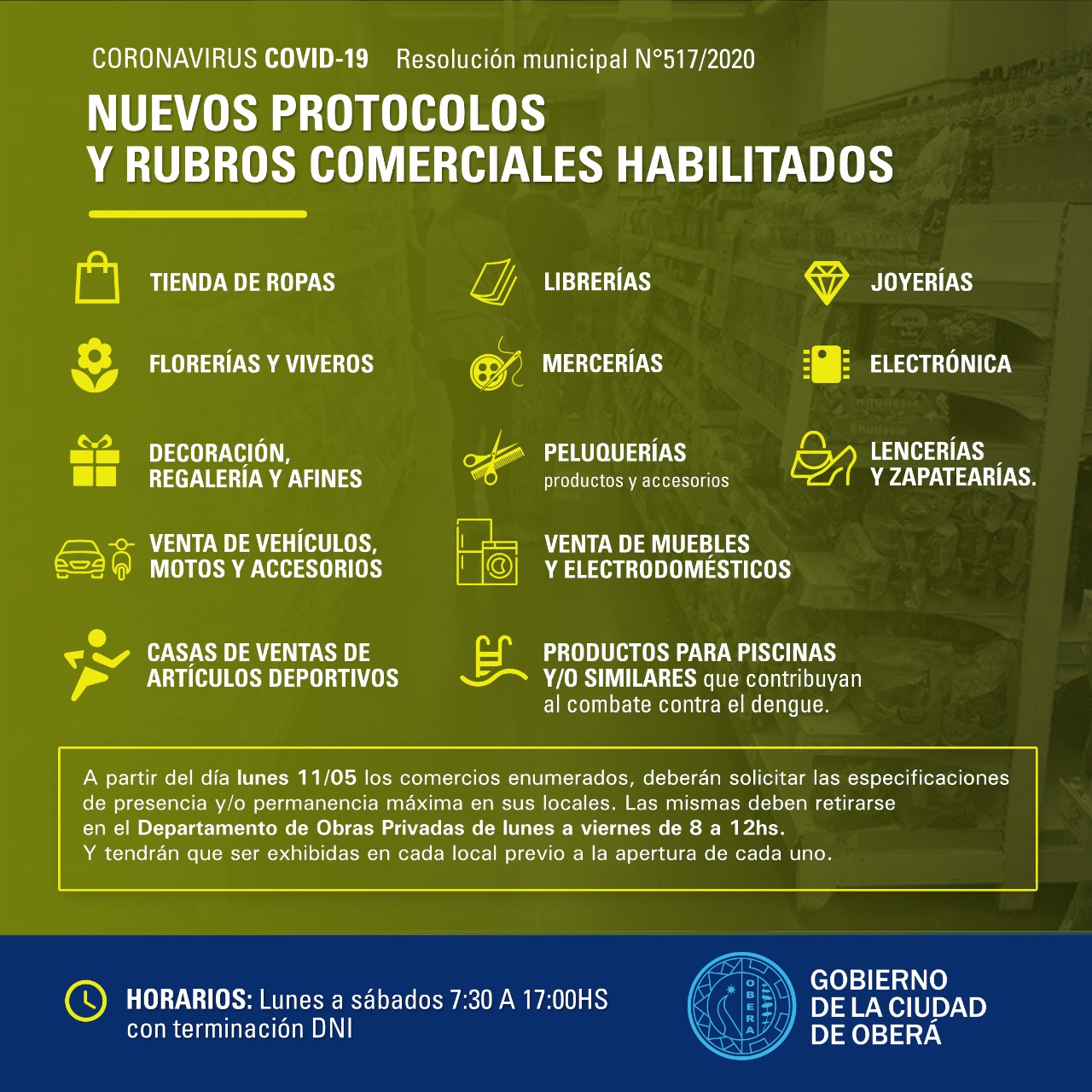 Desde mañana rige también el nuevo horario comercial en la ciudad: de lunes a sábados de 7.30 a 17 horas, de corrido, con protocolo sanitario estricto, aseguran. Seguir leyendo «Oberá habilita nuevos rubros desde este lunes»