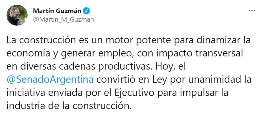 Seguir leyendo «Guzmán ponderó a la construcción como «motor potente para dinamizar la economía y el empleo»»El ministro de Economía destacó la ley que aprobó el Senado que otorga grandes incentivos tributarios para «aquellos que canalicen sus ahorros en inversiones para las construcciones».