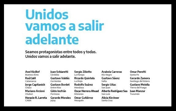 Seguir leyendo «Solicitada: Unidos vamos a salir adelante»Las autoridades máximas de los 24 distritos de Argentina (gobernadoras, gobernadores y jefe de Gobierno de la Ciudad Autónoma de Buenos Aires) suscribieron una solicitada que publicarán este domingo 11 de octubre, donde acompañan al Gobierno argentino en las medidas sanitarias implementadas en el marco de la pandemia de Covid19 y, además, exhortan a la población a mantener las medidas de prevención para que el sistema de salud pueda dar respuesta a aquellos que lo necesiten, indican.