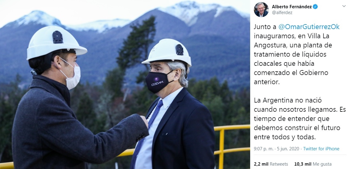 El Presidente destacó la inauguración en la localidad neuquina de Villa La Angostura de una planta de tratamiento de líquidos cloacales que había comenzado el gobierno anterior. Seguir leyendo ««Argentina no nació cuando nosotros llegamos»»