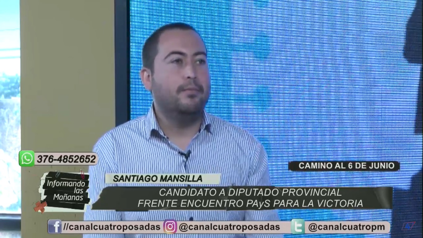 Seguir leyendo «Santiago Mansilla: «no somos paracaidistas de la política»»“No somos paracaidistas de la política, hace muchos años que venimos trabajando al lado de Cristina Brítez” enfatizó Santiago Mansilla en una entrevista con Canal 4 de Posadas que se replica en varios canales de cable de toda Misiones. En un contexto caracterizado por la avanzada contra la democracia de las derechas anti-políticas en todo el mundo, el candidato que encabezará la lista del Frente Encuentro Popular Agrario y Social para la Victoria en las elecciones del 6 de junio, sostuvo que la política es la única herramienta con la que cuenta el pueblo para transformar la realidad. Adelantó la posibilidad de que Máximo Kirchner llegue a Misiones a respaldar al kirchnerismo.