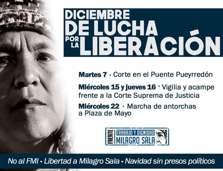 Seguir leyendo «“A cortar con tanta dulzura con los miserables del Fondo”»Militantes del Frente Milagro Sala rechazarán la presencia del Fondo Monetario Internacional en la Argentina -y un eventual consenso para el pago de la deuda-, a través de distintas movilizaciones por el país. En Posadas, la concentración será este martes desde las 11 en la plaza 9 de Julio. Las consignas: No al FMI; libertad a Milagro Sala; por una Navidad si presos políticos.