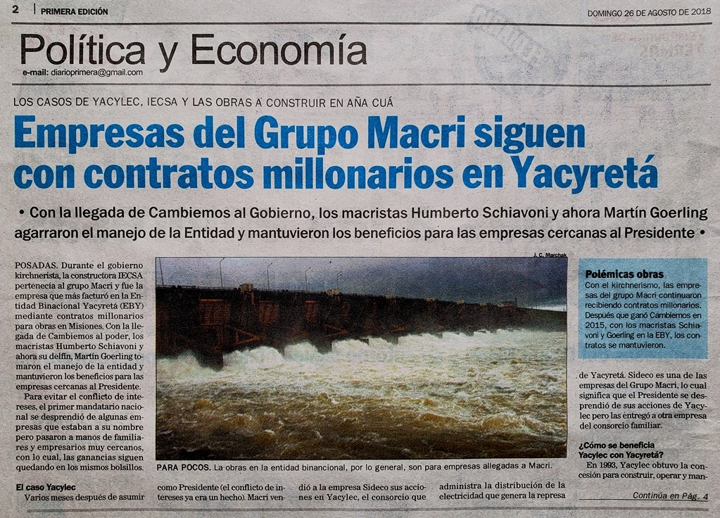 La información de Primera Edición sobre los contratos millonarios del Grupo Macri con Yacyretá desde los 90 hasta la actualidad más allá de los colores políticos de los gobiernos de turno, fue una bomba desactivada por el juez Bonadío al limitar sus investigaciones entre los años 2008 y 2015. Donde puede estallar es en la disputa diplomática entre Estados Unidos y China ya que el comité ejecutivo de la EBY dejaría al margen de la licitación por Aña Cuá, tanto de las obras civiles y provisión del equipamiento electromecánico al gigante grupo chino Gezhouba”.