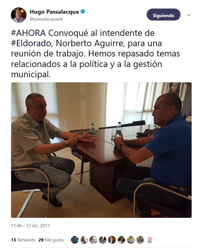 El Gobernador publicó en su cuenta oficial de Twitter una foto donde se muestra, en su despacho, junto al intendente Norberto Aguirre. El mensaje de Passalacqua trasciende el mero hecho informativo de la reunión y se torna un apoyo manifiesto, luego de los acontecimientos políticos que envuelven a Eldorado.