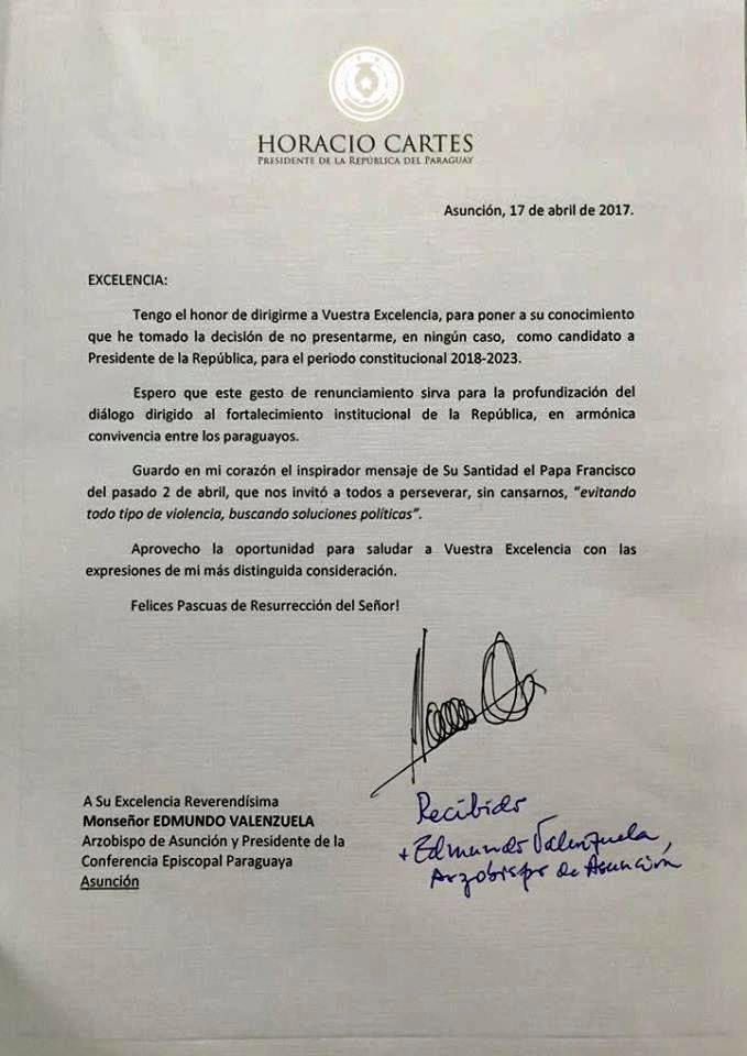 Horacio Cartes -por carta y por video- dice que abandonó la idea de volver a postularse a la Presidencia del Paraguay. Revela la intención en una carta enviada al arzobispo de Asunción en la que rescata el mensaje del Papa Francisco el pasado 2 de abril. Seguir leyendo «Cartes dice que no será candidato»