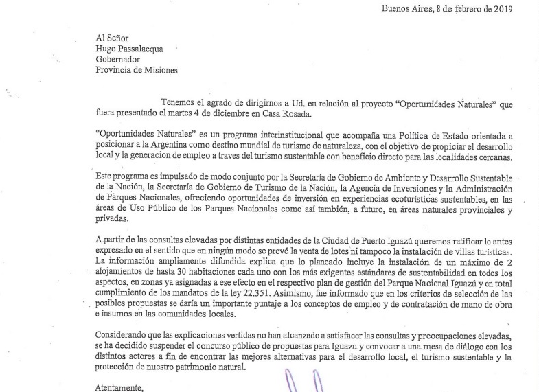 A través de una nota remitida al gobernador Passalacqua, dan cuenta de la suspensión del “concurso público de propuestas dentro del marco de Oportunidades Naturales para Puerto Iguazú” y proponen la conformación de una mesa de diálogo para encontrar mejores alternativas. Seguir leyendo «El Gobierno nacional comunicó por escrito a Misiones que suspende las licitaciones en el Parque Iguazú»