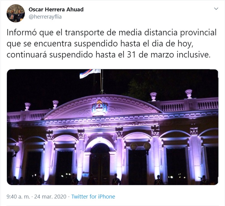 Lo informó el gobernador Oscar Herrera Ahuad, la medida que originalmente fue anunciada hasta el día de 25 de marzo fue extendida hasta el último día del mes de marzo. Su objeto es prevenir la circulación de personas dentro del territorio de la provincia y minimizar el riesgo de contagio del virus.