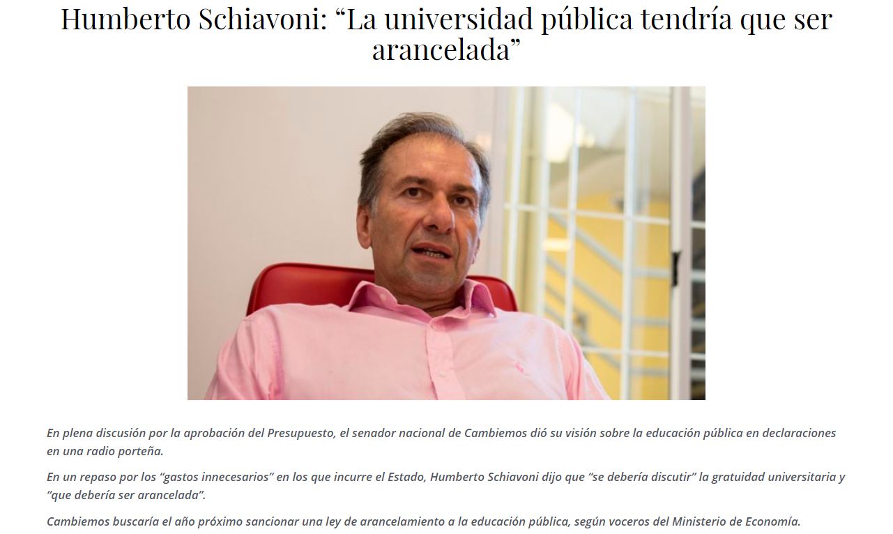 Circuló una “fake news” que atribuía a Schiavoni proponer el arancelamiento de la universidad pública. La noticia, difundida por whatsapp desde Buenos Aires, es falsa, pero el daño está hecho. No obstante encendieron alarmas porque el rumor es coherente con las políticas de la Alianza Cambiemos. El gremialista Velázquez salvó la trayectoria del senador del PRO pero destacó que “no es cuestión de bajar la guardia, no se puede descartar que si Macri logra la reelección el año que viene el arancelamiento figure en agenda.