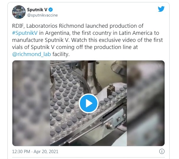 Seguir leyendo «El Fondo de Inversión Rusa anunció que la Argentina comenzó la producción de la vacuna Sputnik V»La empresa farmacéutica Laboratorios Richmond Sacif produjo el primer lote de la vacuna rusa contra el coronavirus, que deberá ser controlado por el Centro Gamaleya.